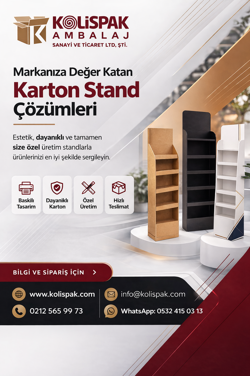 Kolispak Ambalaj olarak; markanıza özel, baskılı, dayanıklı ve ihtiyaca uygun karton stand üretimleri sunuyoruz. Ürün teşhirinde estetik görünüm ile fonksiyonelliği bir araya getirerek satış alanlarınıza profesyonel çözümler üretiyoruz.